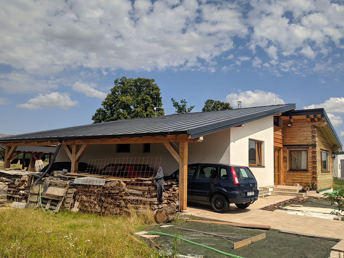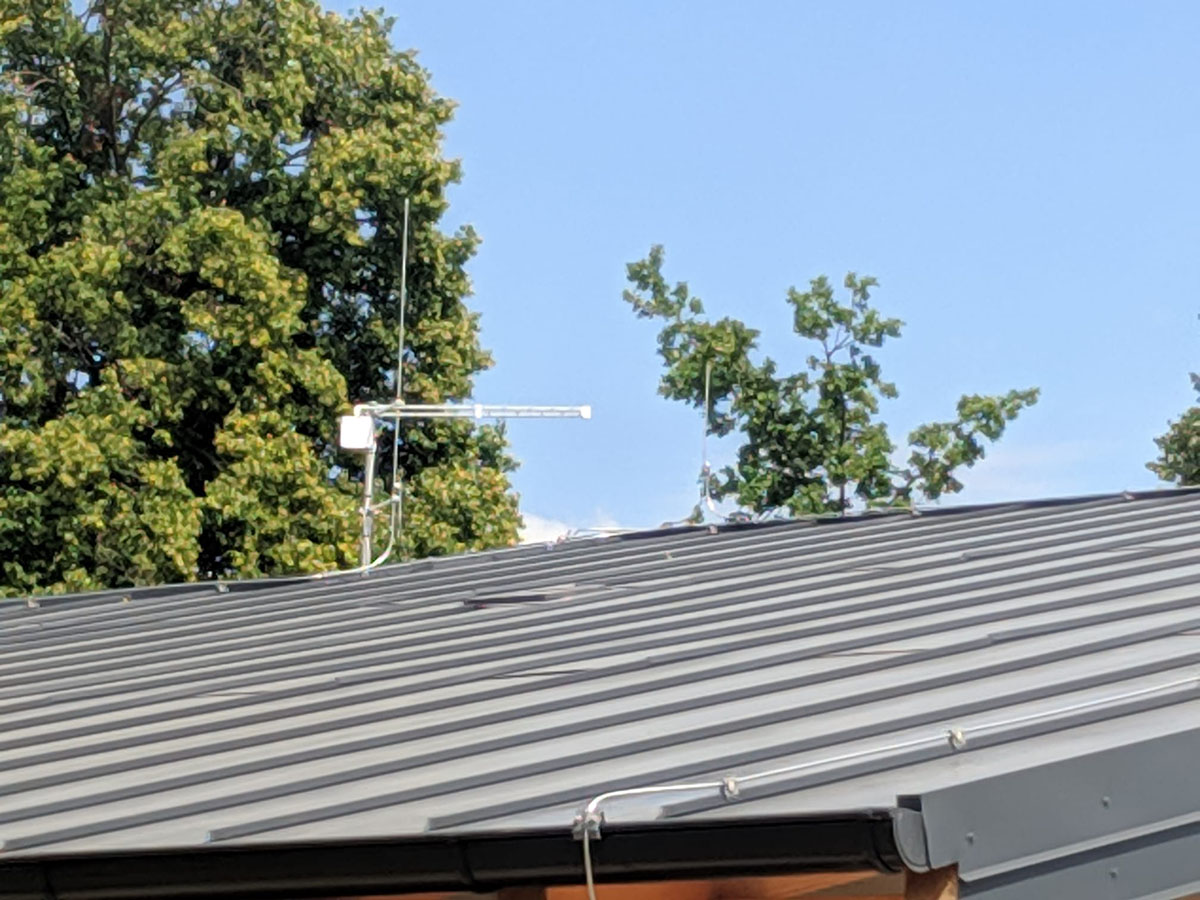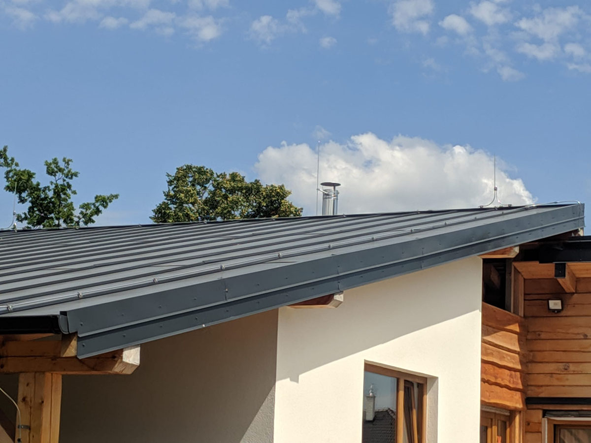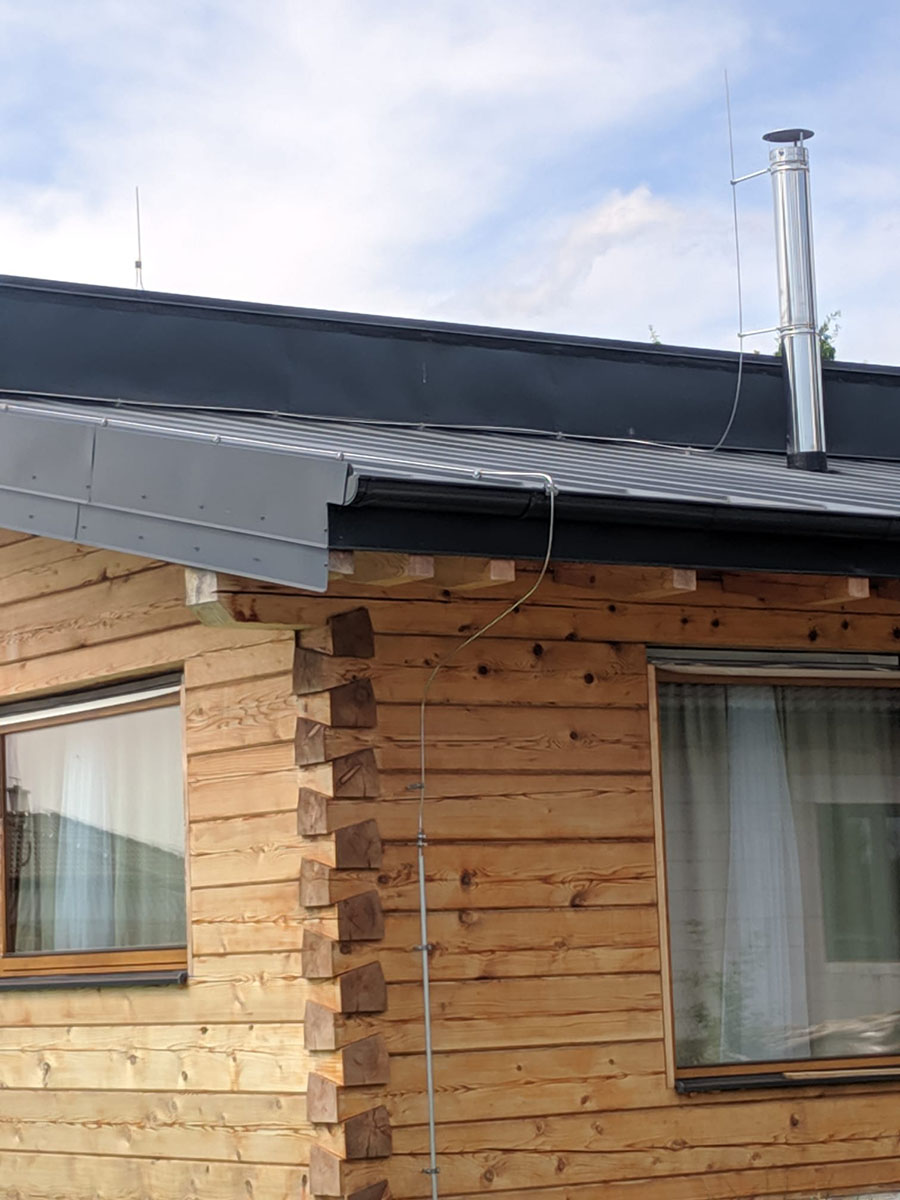 V obci Břehy jsme instalovali hromosvod na plechové falcované střeše s oddálenými jímači na nerezovém komíně a anténě.