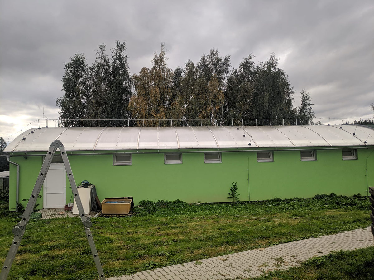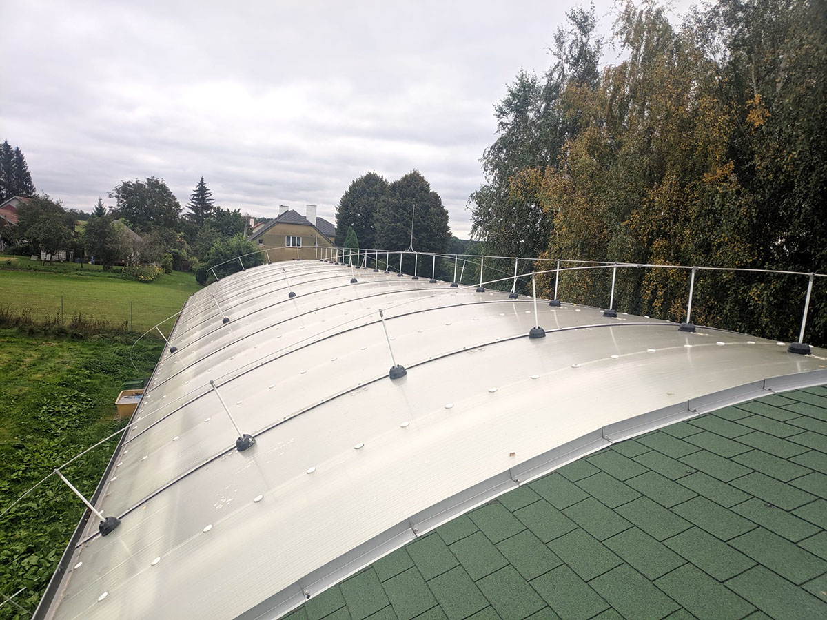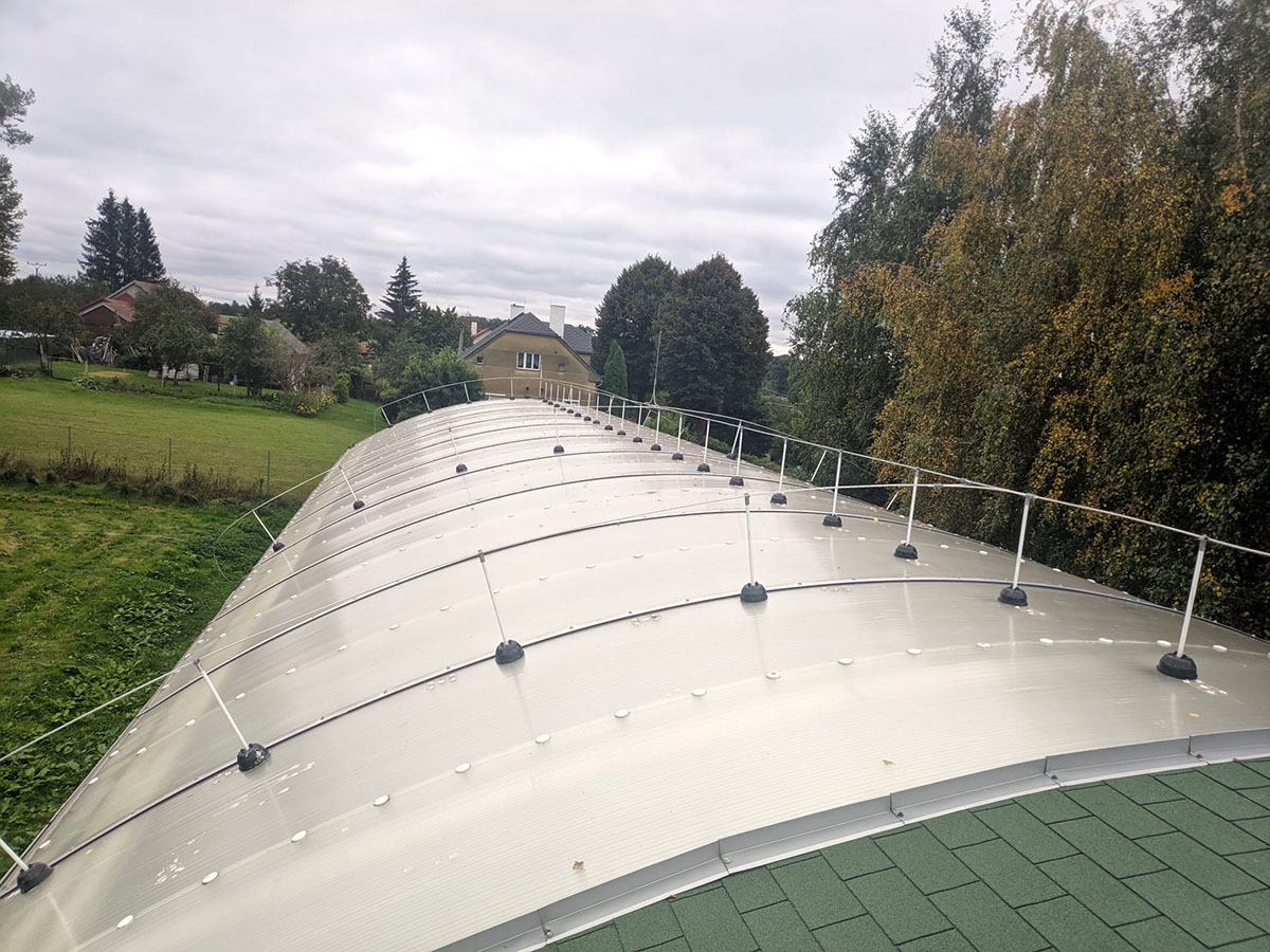V dubnu 2020 jsme na hale v Janově namontovali speciální oddálený hromosvod od nosných ocelových vazníků, z důvodu zavěšení klecí na chov papoušků pomocí ocelových lanek.