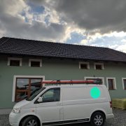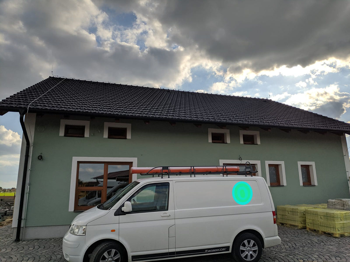 Zde jsme montovali hromosvod na podkrovním domě (průmyslové budově) se sedlovou střechou a oddáleným jímačem na anténě.